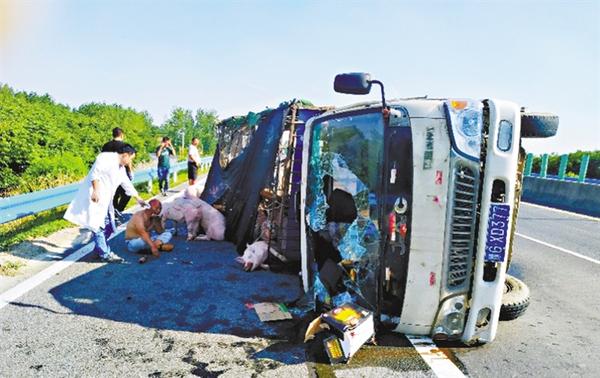 本报讯 7月1日下午,大广高速周口段发生一起交通事故,一辆运载50多头生猪的小货车与一辆半挂货车发生碰撞后侧翻,生猪在高速公路上乱窜,情况危急。市公安局交通管理支队高速二大队(以下简称高速二大队)民警紧急救援,及时恢复高速公路通行。