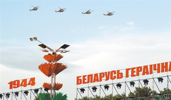 当地时间7月1日,直升机从白俄罗斯首都明斯克上空飞过。