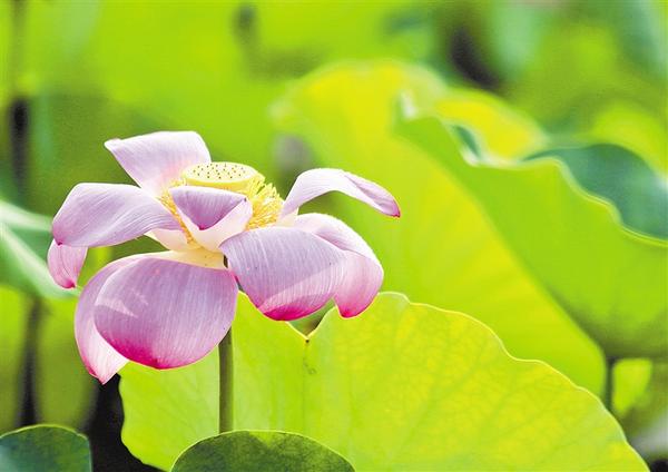 在水波微澜的湖面上,湖天一色,烟水空蒙。湖面飞鸟掠过,和着歌,冲击长空。荷叶撑破碧水,亭亭玉立,像出水的芙蓉美人,有的含苞待放,有的已经怒放,有的还是花骨朵……荷花随风舞动,送来淡淡清香,沁人心脾。