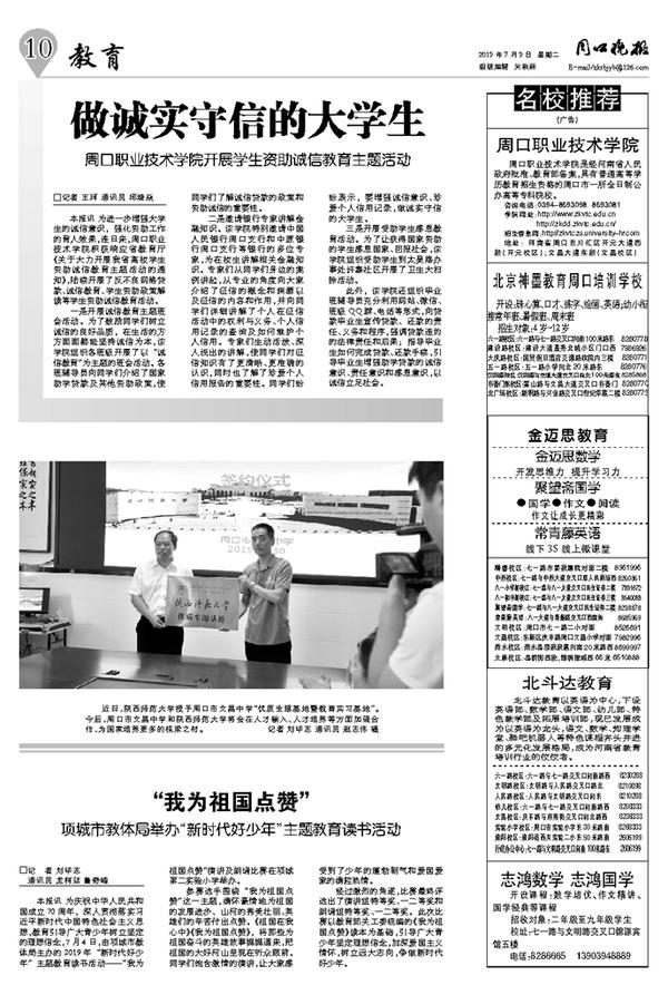 本报讯 为进一步增强大学生的诚信意识,强化资助工作的育人效果,连日来,周口职业技术学院积极响应省教育厅《关于大力开展我省高校学生资助诚信教育主题活动的通知》,陆续开展了反不良网络贷款、诚信教育、学生资助政策解读等学生资助诚信教育活动。