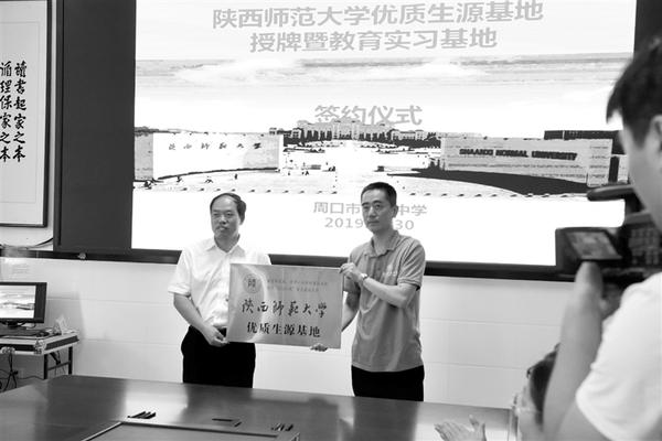近日,陕西师范大学授予周口市文昌中学“优质生源基地暨教育实习基地”。今后,周口市文昌中学和陕西师范大学将会在人才输入、人才培养等方面加强合作,为国家培养更多的栋梁之材。记者 刘华志 通讯员 赵志伟 摄