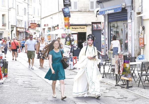 当地时间7月8日,在法国阿维尼翁,中国参展剧目、来自江苏省苏州昆剧院的《浮生六记》演员在街头向观众推介其主演的作品。