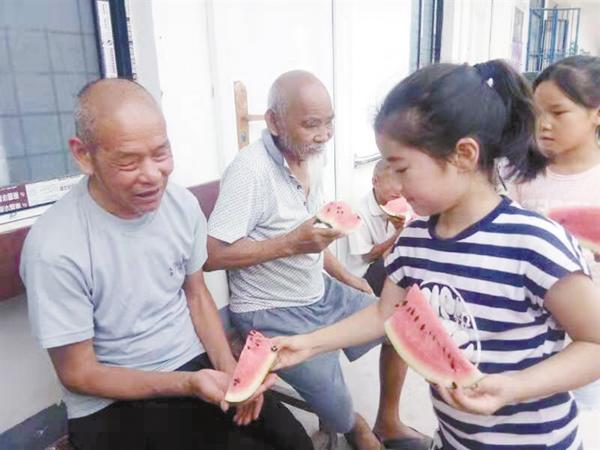 7月12日,9岁的孙梦露与父母一起从郑州回到太康老家。之后,孙梦露带着用零花钱买来的西瓜、油条等食品,看望太康县高朗乡特困人员托养中心的老人。记者 马治卫 通讯员 孙合理 摄