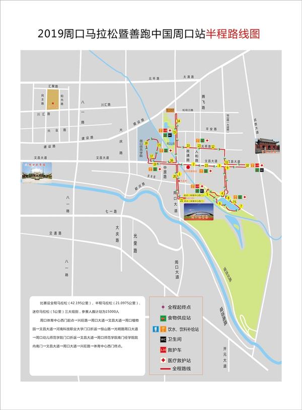 半程马拉松比赛路线是:市体育中心西门起点→文体路→周口大道→文昌大道→周口植物园→文昌大道至河南科技职业大学门口折返→大成路→光明路→周口大道幼师门口折返→文昌大道→周口师范学院→文昌大道→周口大道→文体路→市体育中心西门终点。