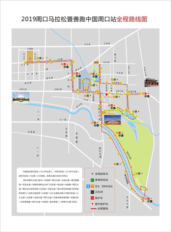 全程马拉松比赛路线是:市体育中心西门起点→文体路→周口大道→文昌大道→周口植物园→文昌大道至河南科技职业大学门口折返→大成路→光明路→周口大道幼师门口折返→文昌大道→周口师范学院→文昌大道→大庆路→川汇大道向西至川汇区广场折返→大庆路→文昌大道→周口大道→沙颍河南岸堤顶路→武盛大道桥→北岸堤顶路→周口大道→文体路→市体育中心西门终点。
