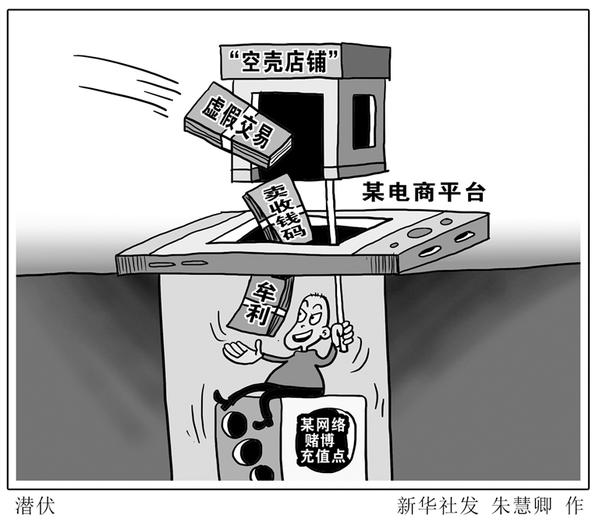 近日,公安部研究部署防范打击整治跨境网络赌博活动相关工作。记者调查发现,有赌博网站充值点藏身知名电商平台。不法分子通过在平台上注册“空壳店铺”套取网络收款码,再以虚假交易、分包垫资等为手段,为赌客充值,向赌博网站输送资金。新华社发 朱慧卿 作
