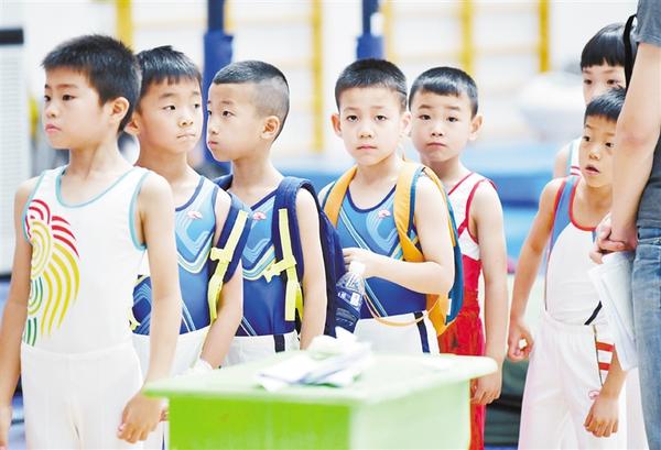 7月21日,参赛小选手在场边做赛前准备。 当日,陕西省青少年体操(含蹦床)锦标赛迎来最后一个比赛日。7月19日至21日,来自陕西各地的120余名小运动员在渭南市青少年体育运动学校进行了高低杠、蹦床、自由体操等多个项目的角逐。 新华社记者 张博文 摄