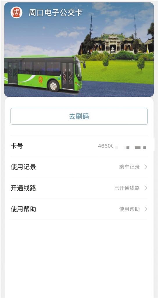 经过测试,大约3分钟时间,记者申请了一张周口电子公交卡。记者首先在支付宝首页搜索“周口电子公交卡”,阅读并同意相关协议后授权个人信息给周口电子公交卡,之后便领取一张带有卡号的周口电子公交卡。使用时,记者在支付宝首页点击“卡包”,选择“周口电子公交卡”,点击“去刷码”生成付款二维码。