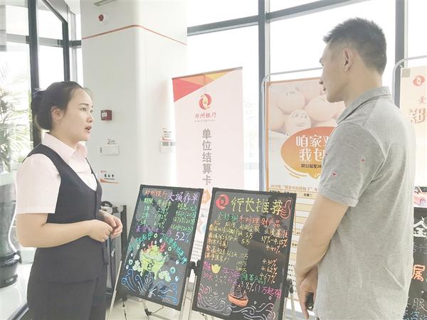 近日,郑州银行周口分行发挥综合优势,围绕目标客户,强化服务意识,增强服务本领,提高服务品质,客户经理认真聆听客户需求,及时发布该行的各种理财产品信息,指导客户选择适合自己的产品。图为7月21日,该行客户经理向前来办理业务的客户讲解理财知识。 记者 徐如景 通讯员 张冉 摄