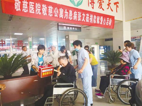 本报讯 7月23日上午,在周口敬慈医院门诊大厅上演感人一幕——周口敬慈养老公寓的20多位老人拄着拐杖、坐着轮椅,自发为患骨肉瘤女孩张文茹捐款。