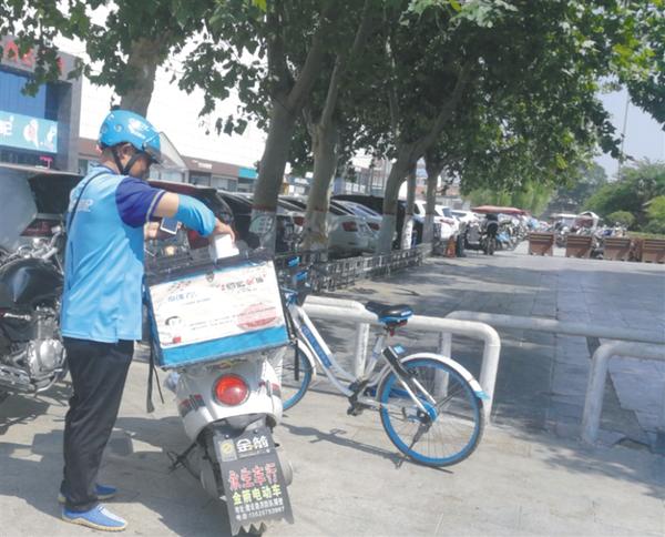 七一路五一文化广场旁,一名外卖小哥接餐后准备出发。