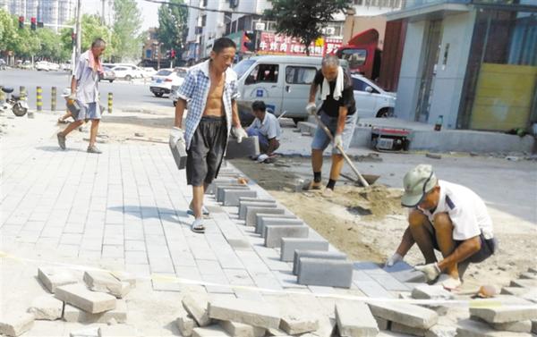 中州大道与文昌大道交叉口处,工人们在烈日下铺设人行道地砖。