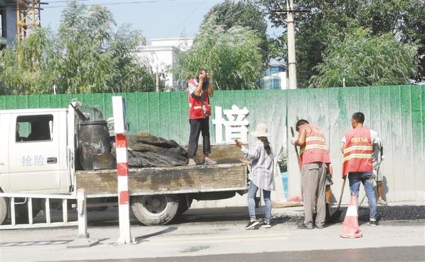 工农南路,市政人员正在烈日下紧张地铺设沥青路面。