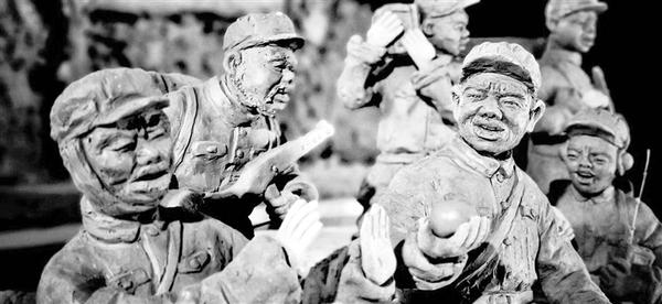 8月1日,由湖南省政府征兵办和湖南卫视联合制作的征兵宣传片《军旅味道》片头,采用了郸城泥人张振福的泥塑《上甘岭》。张振福的这一组泥塑作品反映的是在上甘岭战役中,由于断水,一个苹果8个战士传递3圈才吃完的动人故事,弘扬了志愿军奋勇杀敌、鏖战卫国的精神。 记者 徐松 摄