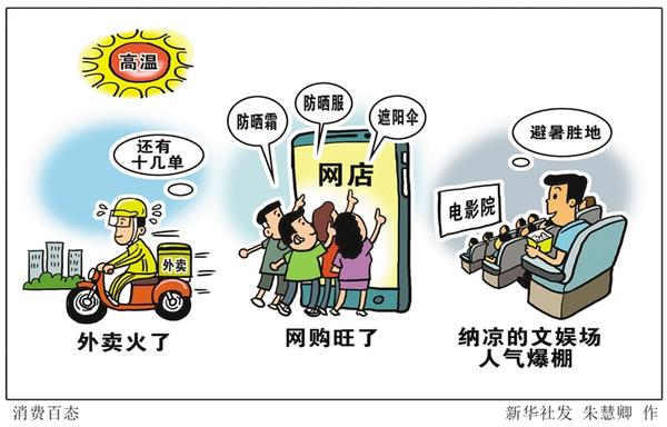 全国多地接连出现35℃以上的高温天气。在炎炎烈日、酷暑闷热中,寻找“清凉”成为人们的选择。由此,居民生活习惯开始发生变化,消费需求也有了新的动向。这个夏天里,外卖火了、网购旺了,纳凉的文娱场人气爆棚……一幕幕火热的场景,勾连出高温下居民的消费百态。