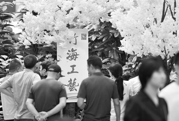8月5日,参会者在天津梅江会展中心举办的订货会上观赏选购仿真花卉产品。