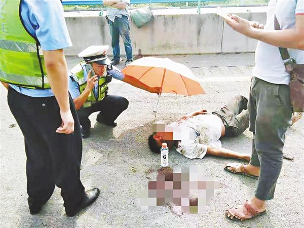 到达现场后,李奇托发现道路出现拥堵,事故车辆需用大型拖车牵引才能移动,伤者头部、胸部受伤。为避免伤者二次受到伤害,民警决定暂不移动伤者,等120医护人员来到后再行施救。9时许,高速公路地表温度已经接近40摄氏度。为减轻伤者痛苦,辅警蒋郭勇从车上找来一把伞,蹲在伤者身旁撑开为其遮阳(如图)。其间,他还不停地对伤者呼喊和讲话,让伤者保持清醒,避免昏迷。不久,120救护车来到现场,蒋郭勇、靳帅兵等人在医生指导下把伤者抬上救护车送往医院急救。