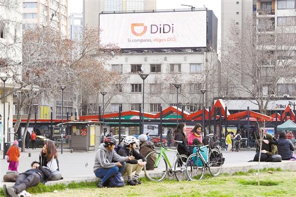 这是当地时间8月6日在智利首都圣地亚哥市中心的意大利广场附近拍摄的滴滴出行的广告牌。