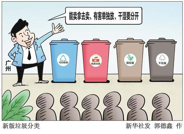 广州市城管部门8月9日发布了2019年版居民家庭生活垃圾分类投放指南,延续“能卖拿去卖、有害单独放、干湿要分开”的原则,对四大类100多种细目生活垃圾种类类别、投放注意事项、容易混淆的生活垃圾进行了较细致的列举。新华社发 郭德鑫 作
