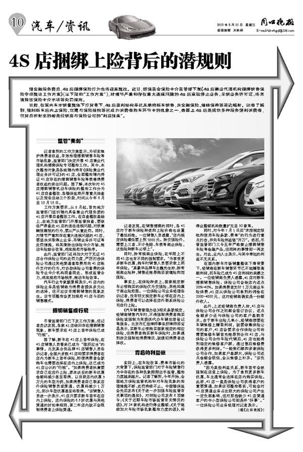 目前,在国内车市销量整体下行背景下,4S店盈利结构早已从单纯新车销售,向金融保险、维修保养等周边辐射。记者了解到,强制新车店内上保险、优惠与保险挂钩等已成为消费者购车环节中的乱象之一,表面上4S店是提供多种服务便利消费者,但背后折射出的却是经销商与保险公司的“利益往来”。