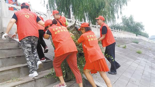 本报讯 8月25日5时50分,在周口中心城区沙颍河南岸(中州大道桥至八一大道桥段),60多名来自周口市慈孝文化促进会的志愿者早早聚集到这里,开展“守护母亲河 环保志愿行”社会服务活动,对沙颍河堤坡垃圾进行清理(上图)。
