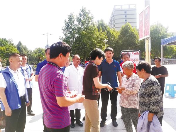 在川汇区文化广场,市慈善总会爱行天下工作委员会、市慈善总会爱心粥屋工作委员会联合爱心商家免费发放治疗高血压的药品,并向老年人赠送体检卡。