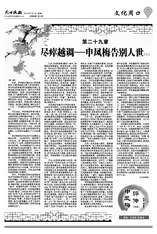 两天过后,身体刚刚缓过点劲儿来,申凤梅便又开始工作了。她把团长江泳叫到床前,先是与他商量剧团下一步的改革与发展,接着安排起了下半年的排练与演出,并让江泳抓紧做好《七擒孟获》的录像工作。那几天,江泳按照她的安排,将工作一件件落实后向她汇报,她方才放下心来。但是到了7月19日,大家见到她在家虽经医生治疗病情不见好转,便硬是把她送进了医院。到了次日凌晨4点50分,申凤梅终因心脏病复发医治无效,告别了人世。