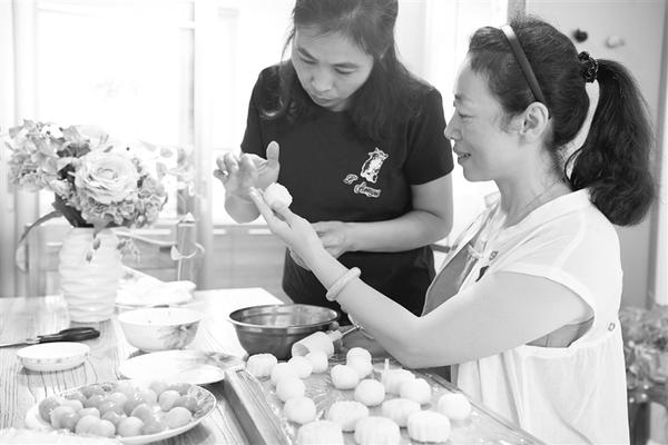 为迎接中秋佳节,昨日,市民郭女士和朋友一起做月饼。郭女士告诉记者:“虽然市面上的月饼种类不少,但自己做的月饼更有意义。”记者 孙安平 摄
