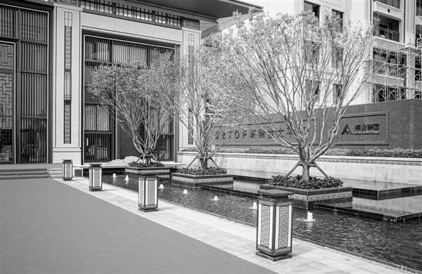 其次,就是园林取材的用心。除了会客厅门前单株价格3~4万元的6棵鸡爪槭外,门前行道树为30多棵直径在20厘米以上的国家二级重点保护植物——榉树,与有20多年树龄的朴树组成了“前榉后朴”的江南院子园林景观布局。售楼部内还花费近百万元移栽了享有“松之王”美誉的黑松,园林品质的高端感不言而喻。