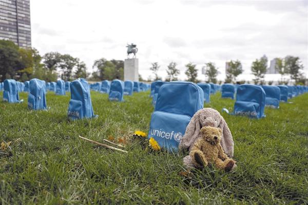 这是当地时间9月10日在纽约联合国总部拍摄的联合国儿童基金会制作的装置艺术作品,3758只蓝色书包象征了2018年在世界各冲突地区丧生的儿童。