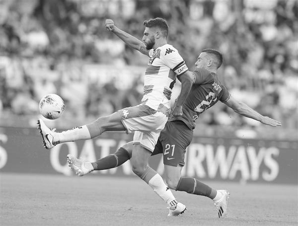 图为当日罗马队球员韦勒图(右)与萨索洛队球员贝拉尔迪拼抢。