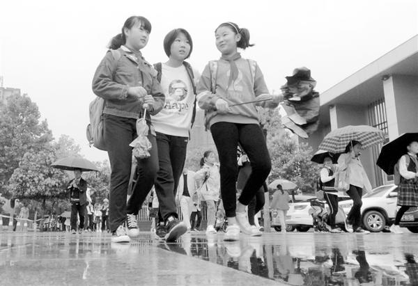9月16日,中心城区庆丰路,几名小学生身着秋装走在上学路上。一场秋雨一场寒,当日我市气温骤降,让市民感受到了浓浓的寒意。 记者 关秋丽 摄