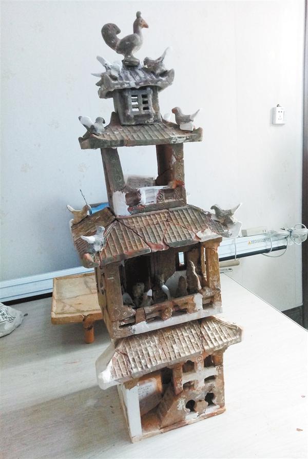 本次出土的文物具有重要价值,出土的珍贵文物有青铜戈、陶戏楼、陶磨、人俑、唐三彩、白玉双龙配、龙形玉璜等。据介绍,我市首次考古发掘出的汉代四层陶戏楼(如图),其底层有栅杆和楼梯;二层分前后两部分,前部分有人在吹乐器,有人在弹琴,后部分有演员休息处;三层是个方形平台,初步推断是听乐赏舞之处;四层为屋阙,上立一凤鸟。此外,陶戏楼左右各有一门,门可开动。