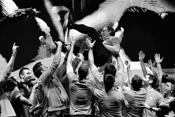 9月17日,西班牙国家篮球队主教练斯卡里奥罗被球员抛起。
