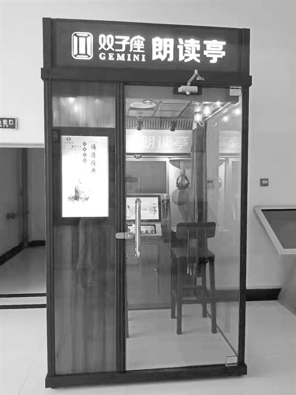 在市图书馆三楼一角,记者见到了朗读亭(如图)。它很像电话亭,不足3平方米,内置装有触摸点播系统触控机的小吧台,以及电子屏、麦克风和耳机,再加上两把椅子,这就是朗读亭的全部设备。据介绍,朗读亭可进行国学、诗歌、散文等诵读录音,甚至还能K歌。