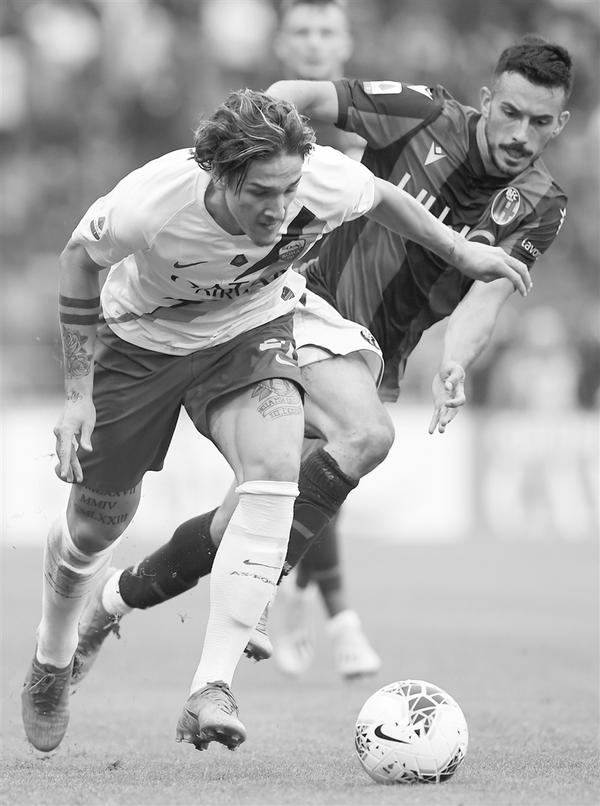 图为当日罗马队球员扎尼奥洛(左)和博洛尼亚队球员桑索内拼抢。
