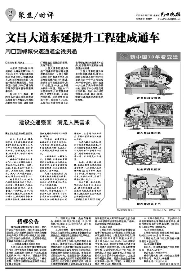 本报讯 为新中国70华诞献礼,为跨越发展加油。9月26日上午,文昌大道东延提升改造工程正式建成通车,周口到淮阳(南部)、郸城一路向东畅通无阻。市委书记刘继标、市长丁福浩等市领导到通车现场开展观摩活动。