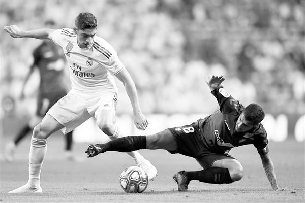 图为当日皇家马德里队球员巴尔韦德(左)和奥萨苏纳队球员梅里达在比赛中拼抢。