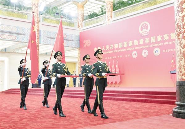 人民大会堂金色大厅,气氛热烈庄重。巨幅红色背景板上,共和国勋章、友谊勋章、国家荣誉称号奖章图案熠熠生辉。背景板前,18面鲜艳夺目的五星红旗分列两侧,18名英姿挺拔的解放军仪仗队礼兵在授勋台两侧持枪伫立。