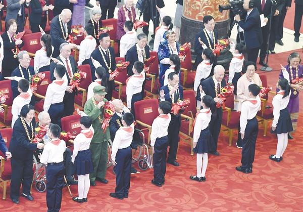 习近平指出,今天,受到表彰的还有长期给予我们支持和帮助的中国人民的老朋友、好朋友。我们衷心感谢他们对中国发展作出的贡献。中国人民愿同世界各国人民一道,推动构建人类命运共同体,让我们这个星球越来越美好。