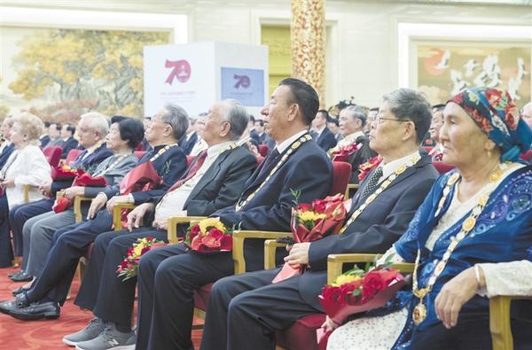 王沪宁宣读习近平签署的中华人民共和国主席令。主席令指出,为了庆祝中华人民共和国成立70周年,隆重表彰为新中国建设和发展作出杰出贡献的功勋模范人物,弘扬民族精神和时代精神,根据第十三届全国人民代表大会常务委员会第十三次会议的决定,授予于敏等8人共和国勋章,授予劳尔·卡斯特罗·鲁斯等6人友谊勋章,授予叶培建等28人国家荣誉称号。