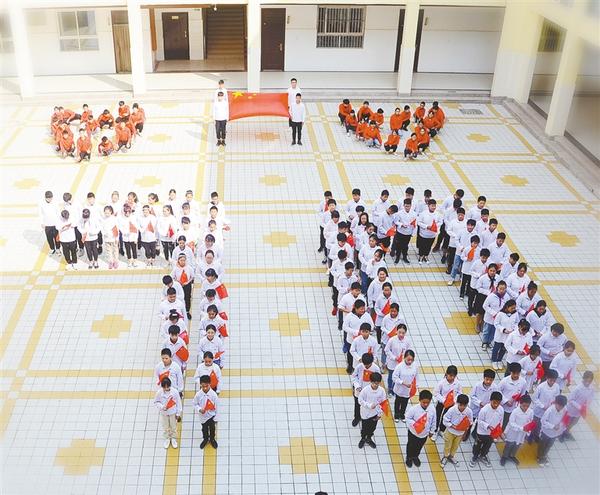 9月30日,市经济开发区黄泛区初级中学百余名师生用唱红歌、摆造型的方式,庆祝新中国成立70周年。 记者 姬慧洋 摄