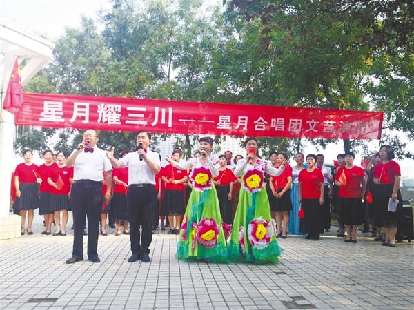 9月30日,星月合唱团在中心城区中州大道与沙颍河南路交叉口西100米处进行公益演出,演员们用嘹亮的歌声,表达对祖国深情的祝福,献礼新中国成立70周年。 记者 黄佳 摄