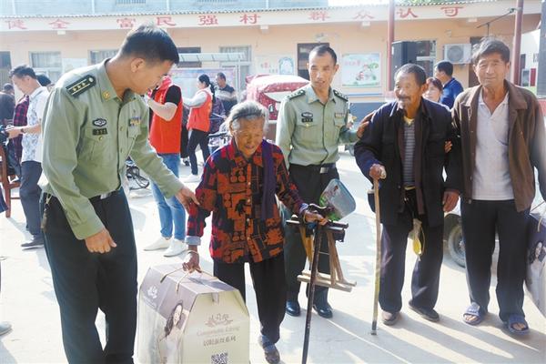 本报讯 阳光明媚,秋高气爽。9月30日上午,为持续推进军民融合和军民共建,合力助推乡村振兴,川汇区人武部按照“支部扶建、群众扶智、五路扶通、项目扶持、少年扶梦、老年扶乐、医疗扶康”七扶活动要求,在城北街道办事处邵寨行政村开展“喜迎国庆 情暖重阳 老年扶乐暨医疗扶康”活动,并为该村45名80岁以上的老人每人送一条“军被”,也为他们送上重阳节的问候。