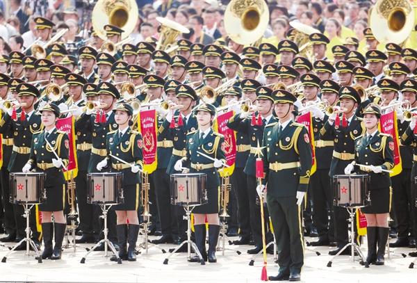 中国人民解放军联合军乐团由1300余名官兵组成,10月1日以立正姿势持续演奏4个小时左右,成员来自全军10个大单位。执行演奏任务的3名总指挥首次穿着陆、海、空三军礼服指挥乐队。