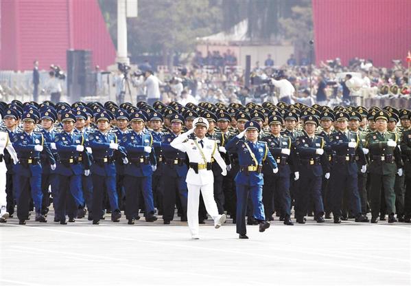 这是仪仗方队首次同时高擎党旗国旗军旗经过天安门接受检阅,也是仪仗方队历次参阅规模最大的一次。