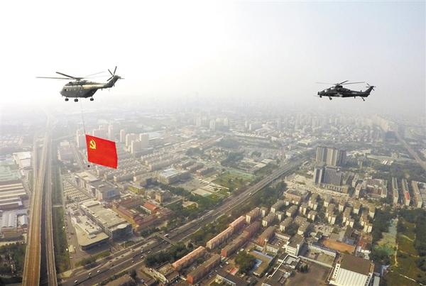 空中护旗梯队:护卫党旗国旗军旗飞过天安门广场上空