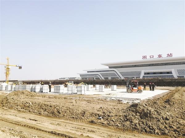 15日上午,记者在郑阜高铁周口东站建设现场看到,站前广场彩虹大道路面砂石铺设已经完成,广场地下一层已经封顶,广场上土方回填基本完成,地下出入口清晰可见,施工人员正在浇筑地面,广场周边的配套设施也正在紧张施工中。