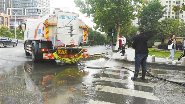 10月20日,中心城区庆丰路与周口大道交叉口处,市城乡一体化示范区工作人员正在清洗路面。近日,我市有关部门抽调人力清洗路面,美化环境,城市变美了,市容变靓了。