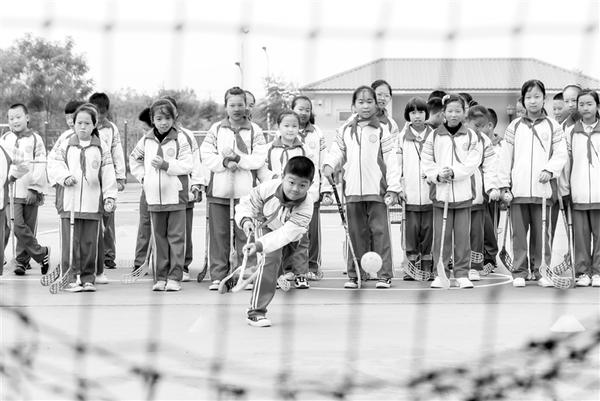 10月23日,邯郸市峰峰矿区外国语实验小学的学生进行陆地冰球训练。